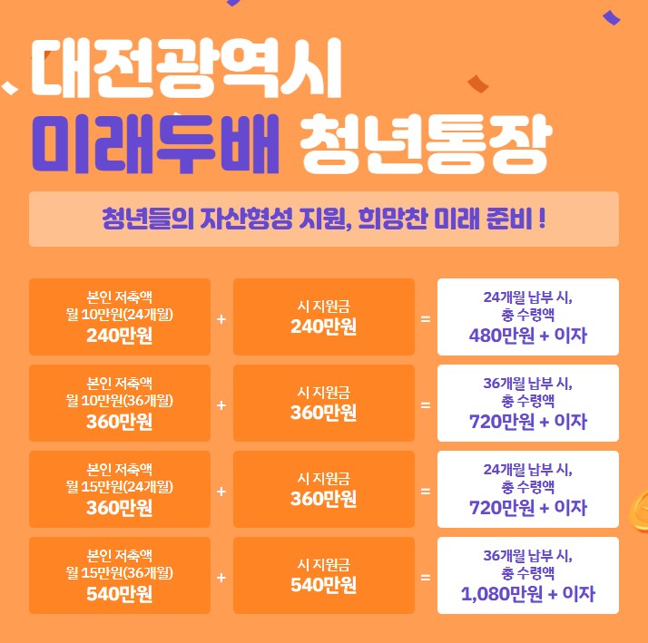 대전광역시에 거주하는 근로 청년이 매월 15만원씩 2년간 저축하면 동일한 금액으로 시 지원금을 매칭 적립 지원하는 통장으로 대전 청년들의 자산 형성을 지원