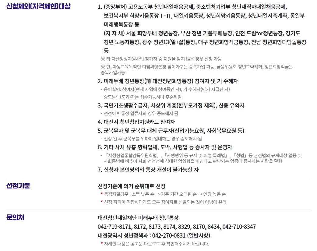 대전청년내일재단 미래두배 청년통장 042-719-8171, 8172, 8173, 8174, 8329, 8170, 8434, 042-710-8347