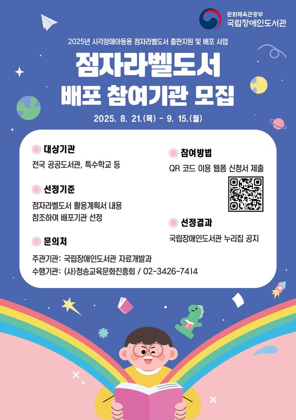 【에이블뉴스 이슬기 기자】국립장애인도서관이 오는 9월 15일까지 ‘시각장애아동을 위한 점자라벨도서’ 소장 희망 기관을 모집한다.