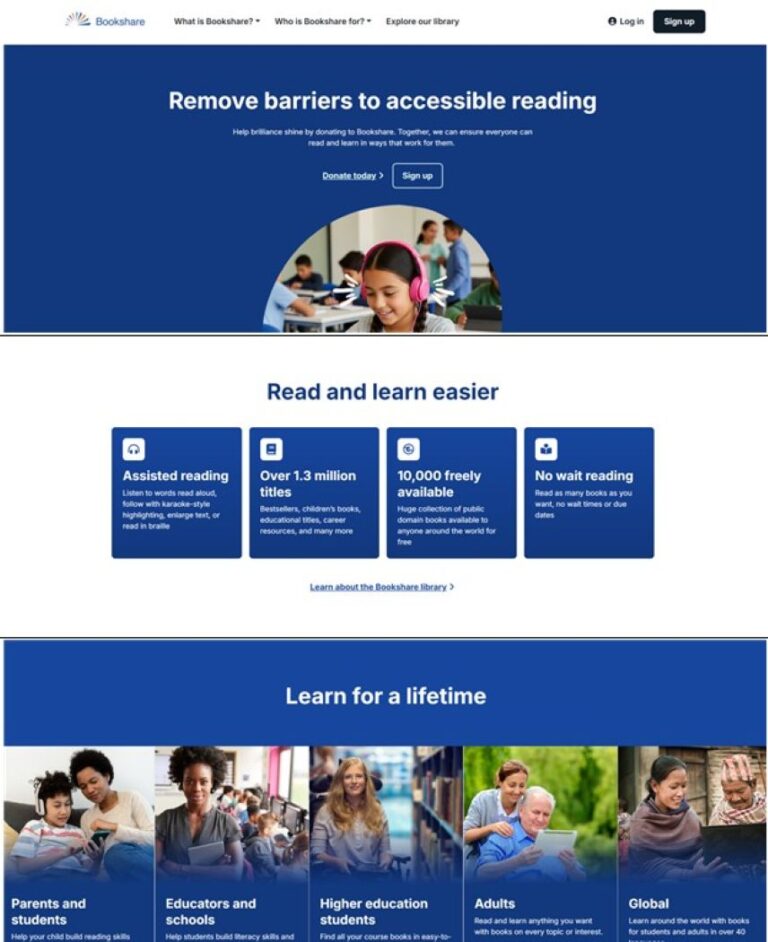 ‘북셰어’는 미국 비영리단체 베네테크(Benetech)가 운영하는 세계 최대 규모의 시각장애인 전용 온라인도서관으로, 교과서와 아동도서, 전문서적 등 전 주제 분야의 자료를 DAISY, EPUB, 점자파일(BRF), MP3 등 다양한 디지털 형식으로 제공한다.