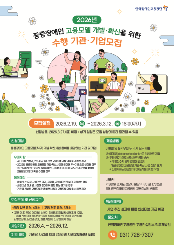 한국장애인고용공단은 취업 취약계층인 중증장애인의 지속 가능한 일자리 창출을 위해 ‘2026년 중증장애인 고용모델 개발·확산 사업’에 참여할 기업과 기관을 모집한다.